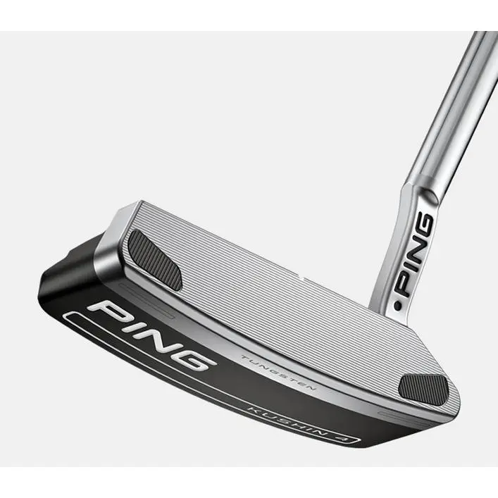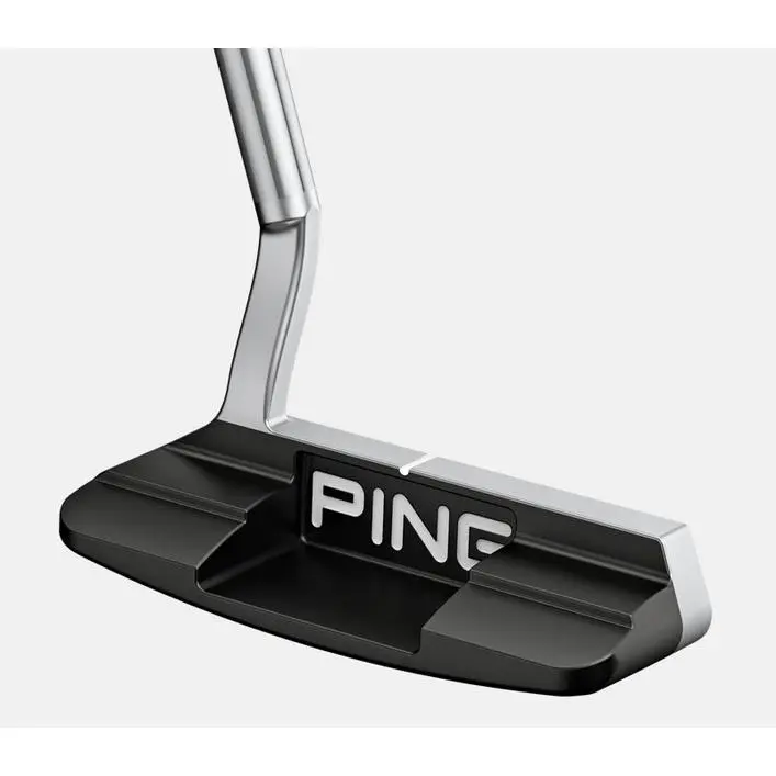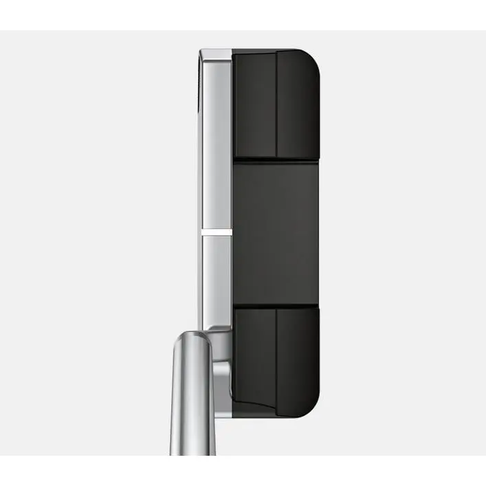 Tungsten toe and heel weights provide stability and forgiveness for improved accuracy, and the shallow milled face delivers a firmer feel, crisp sound and consistent ball speed. The platinum topline (and short alignment line) contrasts against a black, ball-width cavity floor that frames the ball.